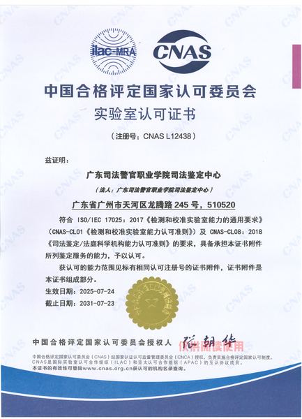 广东司法警官职业学院司法鉴定中心于2016年12月正式成立,是经广东省司法厅核准设立且入选广东法院司法委托专业机构备选名录、广州市中级人民法院司法委托专业机构名册的大型司法鉴定机构。中心鉴定门类齐全,设有法医临床鉴定(含视觉功能、听觉功能及医疗损害鉴定)、法医物证鉴定、法医毒物鉴定、图像鉴定、痕迹鉴定和文书鉴定六个鉴定门类。