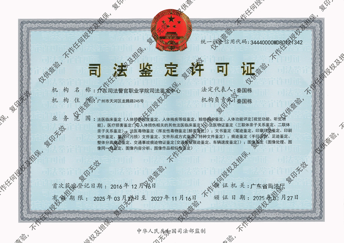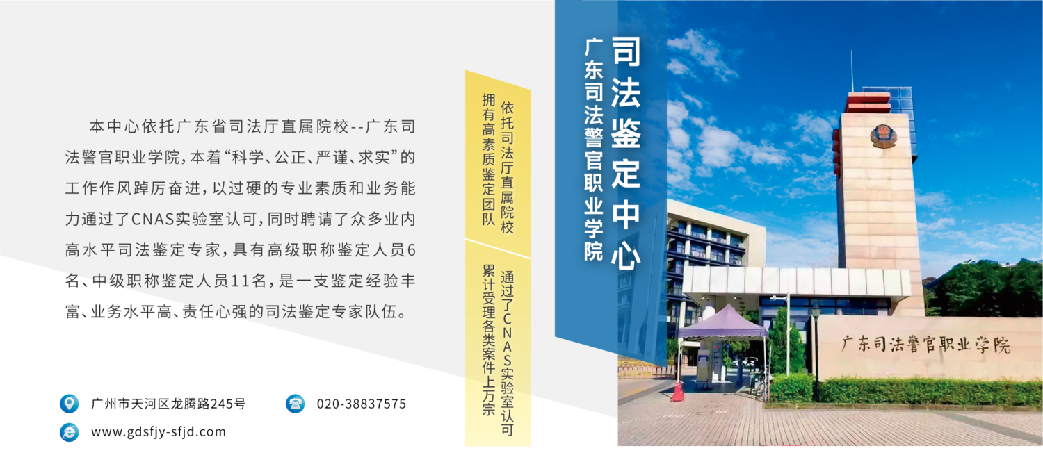 广东司法警官职业学院司法鉴定中心于2016年12月正式成立,是经广东省司法厅核准设立且入选广州市中级人民法院司法委托专业机构名册的大型司法鉴定机构。中心鉴定门类齐全,设有法医临床鉴定(含视觉功能、听觉功能及医疗损害鉴定)、法医物证鉴定、法医毒物鉴定、图像鉴定、痕迹鉴定和文书鉴定六个鉴定门类。